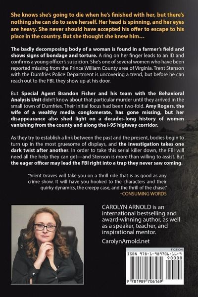 She knows she's going to die when he's finished with her, but there's nothing she can do to save herself. Her head is spinning, and her eyes are heavy. She never should have accepted his offer to escape to his place in the country. But she thought she knew him... The badly decomposing body of a woman is found in a farmer's field and shows signs of bondage and torture. A ring on her finger leads to an ID and confirms a young officer's suspicion. She's one of several women who have been reported missing from the Prince William County area of Virginia. Trent Stenson with the Dumfries Police Department is uncovering a trend, but before he can reach out to the FBI, they show up at his door. But Special Agent Brandon Fisher and his team with the Behavioral Analysis Unit didn't know about that particular murder until they arrived in the small town of Dumfries. Their initial focus had been two-fold. Amy Rogers, the wife of a wealthy media conglomerate, has gone missing, but her disappearance also shed light on a decades-long history of women vanishing from the county and along the I-95 highway corridor. As they try to establish a link between the past and the present, bodies begin to turn up in the most gruesome of displays, and the investigation takes one dark twist after another. In order to take this serial killer down, the FBI will need all the help they can get-and Stenson is more than willing to assist. But the eager officer may lead the FBI right into a trap they never saw coming. Silent Graves is a creepy serial-killer thriller that will have readers turning the pages to unravel every twist. Buy this international bestselling book today and hunt a serial killer alongside the FBI! Perfect for fans of Robert Dugoni, Lisa Regan, and Rachel Caine. Readers love Silent Graves: "Tense and terrifying." -The Reading Café "Nonstop action." ¿¿¿¿¿ "A mystery of tension and intrigue that grabs the reader." ¿¿¿¿¿ "An exciting and tense investigative thriller." ¿¿¿¿¿ "Awesome." ¿¿¿¿¿ "A thrill ride that is as good as any crime show." ¿¿¿¿¿ "Great characters, real dialogue and intrigue make this a stone-cold thriller." ¿¿¿¿¿ "Fantastic and kept me up all night wanting more." ¿¿¿¿¿ "Amazing Work!" ¿¿¿¿¿ "Great characters and lots of twists and turns." ¿¿¿¿¿ "Very well written... Worth buying and reading." ¿¿¿¿¿ "It's so captivating! I highly recommend!" ¿¿¿¿¿ "Great characters. I bought the full set." ¿¿¿¿¿ "Excellent story line and well written." ¿¿¿¿¿ "A real page-turner." ¿¿¿¿¿