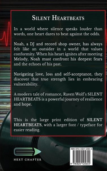 In a world where silence speaks louder than words, one heart dares to beat against the odds. Noah, a DJ and record shop owner, has always felt like an outsider in a world that values conformity. When his heart ignites after meeting Melody, Noah must confront his deepest fears and the echoes of his past. Navigating love, loss and self-acceptance, they discover that true strength lies in embracing vulnerability. A modern tale of romance, Raven Wolf's SILENT HEARTBEATS is a powerful journey of resilience and hope. This is the large print edition of Silent Heartbeats, with a larger font / typeface for easier reading.