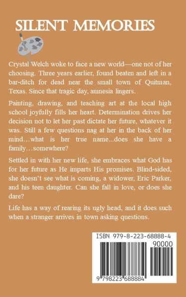 Crystal Welch woke to face a new world-one not of her choosing. Three years earlier, Crystal was found beaten and left in a bar ditch near the small town of Quitman, Texas, for dead. Since that tragic day, amnesia has lingered. Painting, drawing, and teaching art at the local high school joyfully fills her heart. Determination drives her decision not to let her past dictate her future. But a few questions persist in the back of her mind...what is her true name...does she have a family...somewhere? Resolved with her newly established life, she embraces what God has for her future as He imparts His promises. She doesn't see what is coming with a widower, Eric Parker, and his teen daughter. Life has a way of rearing its ugly head, and it does such when a stranger arrives in town asking questions.