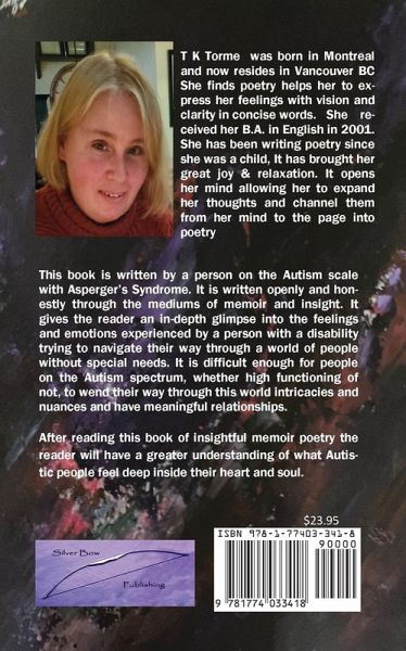 This book is written by a person with Autism and Asperger's Syndrome. It is written openly and honestly through the mediums of memoir and insight. It gives the reader an in-depth glimpse into the feelings and emotions experienced by a person with a disability trying to navigate their way through a world of people without special needs,. Most times, people in general, don't bother to take the time to have meaningful contact with or get to know a person who is "different" from the norm in their social interactions. It is difficult enough for people on the Autism spectrum, whether high functioning of not, to wend their way through this world intricacies and nuances and have meaningful relationships. They have aspirations, wants, needs, desires like any human being has. I hope after reading this book of insightful poetry the reader will have a greater understanding of what Autistic people feel deep inside their heart and soul. Take the time to hear their "silent meow". ~ Candice James, Poet Laureate Emerita, New Westminster, BC CANADA