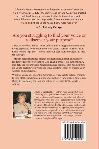 Are you struggling to find your voice or rediscover your purpose? Silent No More by Sharon Trense offers an inspiring path to courageous living, especially for those in their later years. Sharon's journey-from nurse to state legislator-shows that your best years are ahead, no matter your age. Through personal stories of faith and resilience, Sharon encourages readers to reconnect with their God-given purpose, live authentically, and defy the culture that often marginalizes seniors. This book empowers you to reclaim your voice and leave a lasting legacy by sharing your wisdom and experience. Whether you're 40, 60, or 80, Silent No More is a call to action. It's time to step off the sidelines, embrace your authority, and make a difference. Ready to live boldly for God and refuse to stay silent? The world is waiting.