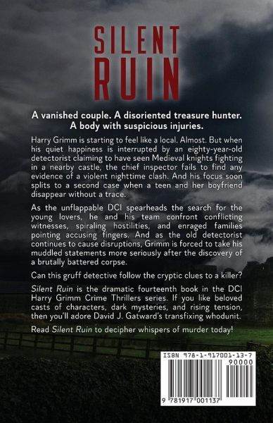 A vanished couple. A disoriented treasure hunter. A body with suspicious injuries. Harry Grimm is starting to feel like a local - almost. But when his quiet happiness is interrupted by a confused eighty-year-old detectorist claiming to have seen Medieval knights fighting in a nearby ruined castle, the chief inspector is forced to investigate the bizarre claims. However, his focus is soon split to a second case when a teen and her boyfriend disappear without a trace. As the unflappable DCI spearheads the search for the young lovers, he and his team confront conflicting witnesses, spiraling hostilities, and enraged families pointing accusing fingers. And with the aging detectorist continuing to cause disturbances around the village, Grimm takes his muddled statements more seriously after the discovery of a brutally battered corpse. Can this gruff detective follow the cryptic clues to a killer? Silent Ruin is the dramatic fourteenth book in the DCI Harry Grimm Crime Thrillers series. If you like beloved casts of characters, dark mysteries, and rising tension, then you'll adore David J. Gatward's transfixing whodunit. Buy Silent Ruin to decipher whispers of murder today! Perfect for fans of L. J. Ross, J. D. Kirk, Adam Croft, Simon McCleave, Alex Smith, J. M. Dalgliesh, J. E. Mayhew, and J. R. Ellis.