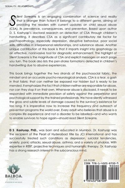 Silent Screams is an engaging combination of science and reality that is stranger than fiction! It belongs to a different genre, aiming at providing the readers with current updates on child sexual abuse (CSA), its prevalence, consequences, and prevention. Based upon author D. S. Kashyap's doctoral research on detection of CSA through children's handwriting, it describes CSA as a significant contributory risk factor for psychopathology, especially depression, disruptive behaviour, poor social skills, difficulties in interpersonal relationships, and substance abuse. Another unique contribution of this book is that it imparts insight into graphology as an effective, noninvasive tool for diagnostic enhancement. The highlight of Silent Screams is the magnitude of CSA and explicit messages on each page you turn. The book also lists the pen-stroke formations detected in children's handwriting due to abusive experiences. This book brings together the two strands of the psychosocial fabric, the mindset and an accurate psycho neurological analysis. CSA is a tear, a gash in that fabric that can neither be exposed nor hidden but is ready to be mended. It emphasizes the fact that children neither are responsible for abuse, nor can they stop it on their own. Whenever abuse is disclosed, it needs to be responded with immediate provision of safety against the perpetrator and psychological support by the trained professionals. We have silently witnessed the gross and subtle levels of damage caused to the survivor's existence for too long. It is imperative now to increase the frequency and outreach of prevention programs the world over. Every adult who believes that abuse is a complex life experience and not a disorder to be labelled-and who wants to enable survivors to hope again-should read Silent Screams.