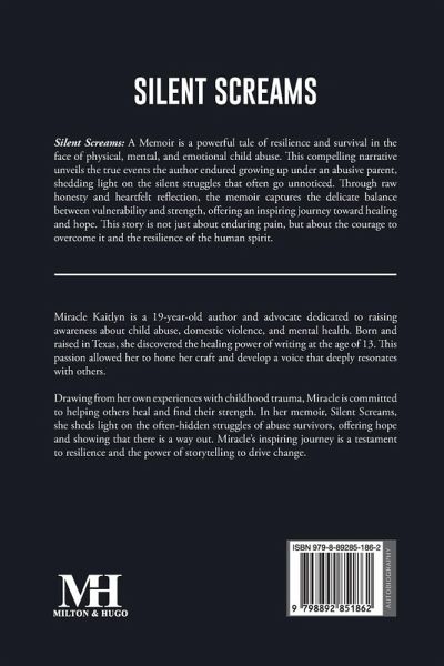 Silent Screams: A Memoir is a powerful tale of resilience and survival in the face of physical, mental, and emotional child abuse. This compelling narrative unveils the true events the author endured growing up under an abusive parent, shedding light on the silent struggles that often go unnoticed. Through raw honesty and heartfelt reflection, the memoir captures the delicate balance between vulnerability and strength, offering an inspiring journey toward healing and hope. This story is not just about enduring pain, but about the courage to overcome it and the resilience of the human spirit.
