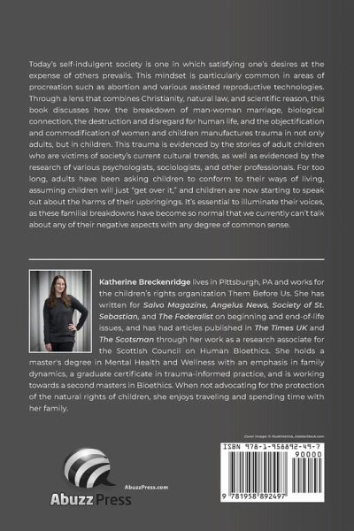 Today's self-indulgent society is one in which satisfying one's desires at the expense of others prevails. This mindset is particularly common in areas of procreation such as abortion and various assisted reproductive technologies. Through a lens that combines Christianity, natural law, and scientific reason, this book discusses how the breakdown of man-woman marriage, biological connection, the destruction and disregard for human life, and the objectification and commodification of women and children manufactures trauma in not only adults, but in children. This trauma is evidenced by the stories of adult children who are victims of society's current cultural trends, as well as evidenced by the research of various psychologists, sociologists, and other professionals. For too long, adults have been asking children to conform to their ways of living, assuming children will just "get over it," and children are now starting to speak out about the harms of their upbringings. It's essential to illuminate their voices, as these familial breakdowns have become so normal that we currently can't talk about any of their negative aspects with any degree of common sense.