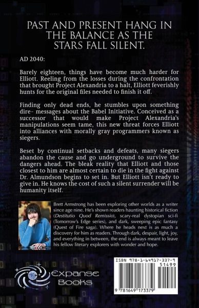 AD 2040: Barely eighteen, things have become much harder for Elliott. Reeling from the losses during the confrontation that brought Project Alexandria to a halt. Elliott feverishly hunts for the original files needed to finish it off. Finding only dead ends, he instead stumbles upon something dire: messages about the Babel Initiative. Conceived as a successor that would make Project Alexandria's manipulations seem tame, this new threat once again forces Elliott into alliances with morally gray programmers known as siegers. Beset by continual setbacks and defeats, many siegers abandon the cause and go underground to survive the dangers ahead. The bleak reality that Elliott and those closest to him are almost certain to die in the fight against Dr. Almundson begins to set in. But Elliott isn't ready to give in. He knows the cost of such a silent surrender will be humanity itself.