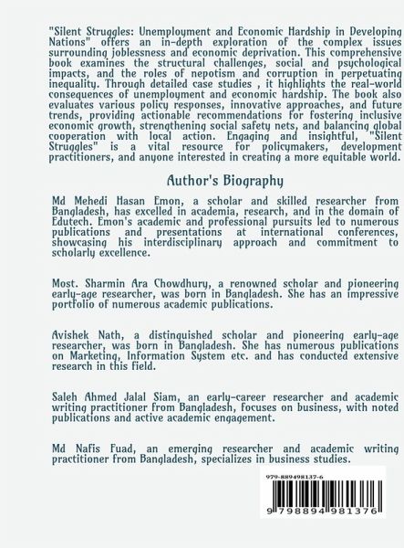 "Silent Struggles: Unemployment and Economic Hardship in Developing Nations" offers an in-depth exploration of the complex issues surrounding joblessness and economic deprivation. This comprehensive book examines the structural challenges, social and psychological impacts, and the roles of nepotism and corruption in perpetuating inequality. Through detailed case studies, it highlights the real-world consequences of unemployment and economic hardship. The book also evaluates various policy responses, innovative approaches, and future trends, providing actionable recommendations for fostering inclusive economic growth, strengthening social safety nets, and balancing global cooperation with local action. Engaging and insightful, "Silent Struggles" is a vital resource for policymakers, development practitioners, and anyone interested in creating a more equitable world.
