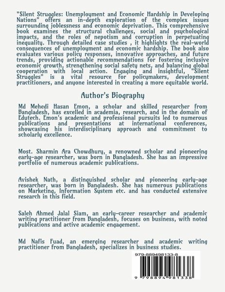 "Silent Struggles: Unemployment and Economic Hardship in Developing Nations" offers an in-depth exploration of the complex issues surrounding joblessness and economic deprivation. This comprehensive book examines the structural challenges, social and psychological impacts, and the roles of nepotism and corruption in perpetuating inequality. Through detailed case studies, it highlights the real-world consequences of unemployment and economic hardship. The book also evaluates various policy responses, innovative approaches, and future trends, providing actionable recommendations for fostering inclusive economic growth, strengthening social safety nets, and balancing global cooperation with local action. Engaging and insightful, "Silent Struggles" is a vital resource for policymakers, development practitioners, and anyone interested in creating a more equitable world.