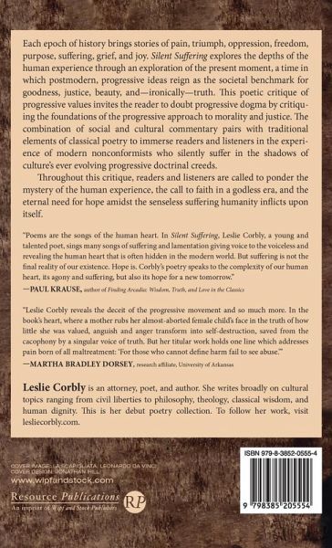 Each epoch of history brings stories of pain, triumph, oppression, freedom, purpose, suffering, grief, and joy. Silent Suffering explores the depths of the human experience through an exploration of the present moment, a time in which postmodern, progressive ideas reign as the societal benchmark for goodness, justice, beauty, and--ironically--truth. This poetic critique of progressive values invites the reader to doubt progressive dogma by critiquing the foundations of the progressive approach to morality and justice. The combination of social and cultural commentary pairs with traditional elements of classical poetry to immerse readers and listeners in the experience of modern nonconformists who silently suffer in the shadows of culture's ever evolving progressive doctrinal creeds. Throughout this critique, readers and listeners are called to ponder the mystery of the human experience, the call to faith in a godless era, and the eternal need for hope amidst the senseless suffering humanity inflicts upon itself.
