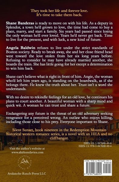 They took her life and forever love. It's time to take them back. Shane Banderas is ready to move on with his life. As a deputy in Splendor, a town he'd grown to love, the time had come to buy a place, marry, and start a family. Six years had passed since losing the only woman he'd ever loved. Years he'd never get back. Time to live for the present, and with luck, a new kind of future. Angela Baldwin refuses to live under the strict standards of Boston society. Ready to break away, she and her close friend head west toward the love stolen from her six long years before. Refusing to consider he may have already married another, she boards the train. She has little going for her except a determination to win him back. Shane can't believe what is right in front of him. Angie, the woman who'd left him years ago, is standing on the boardwalk, as if she belongs there. He knew the truth about her. Trust isn't a word she understands. With no desire to rekindle feelings for an old love, he continues his plans to court another. A beautiful woman with a sharp mind and quick wit. A woman he can trust and share a future. Endangering any future is the threat of an old adversary seeking vengeance for a perceived wrong. An outlaw who enjoys killing, including those close to his prey. Everyone important to Shane. Silent Sunset, book nineteen in the Redemption Mountain historical western romance series, is a novel with an HEA and no cliffhanger.
