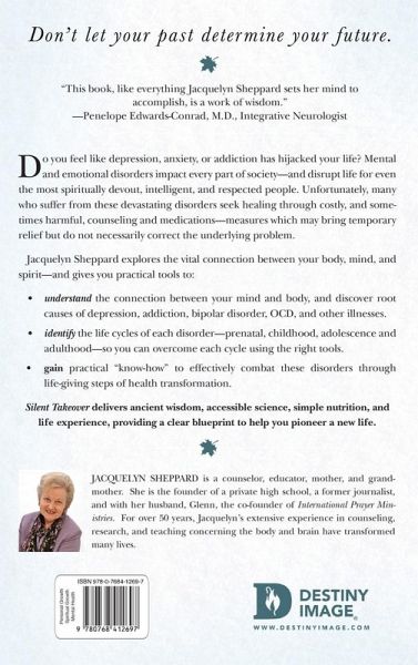 How the Body Hijacks the Mind "This book, like everything Jacquelyn Sheppard sets her mind to accomplish, is a work of wisdom." Penelope Edwards-Conrad, M.D., Integrative Neurologist Do you feel like depression, anxiety, or addiction have hijacked your life? Mental and emotional disorders impact every part of society and disrupt life for even the most spiritually devout, intelligent and respected people. Unfortunately, many who suffer from these devastating disorders seek healing through costly, and sometimes harmful, counseling and medications measures which may bring temporary relief but do not fully correct the underlying problem. Jacquelyn Sheppard exposes the vital connection between your body, mind, and spirit and gives you practical tools to: "understand" the connection between your mind and body and discover root causes for such illnesses as depression, addiction, bipolar disorder, OCD, and others."identify" the life cycles of each disorder prenatal, childhood, adolescence and adulthood so you can overcome each cycle using the right tools. "gain" practical know-how to effectively combat these disorders through life-giving steps of health transformation. "Silent Takeover "delivers ancient wisdom, accessible science, simple nutrition, and life experience while providing a clear blueprint to help you pioneer a new life."