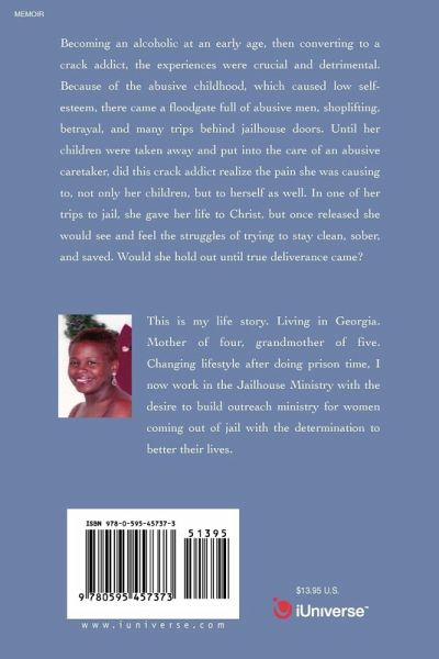 Becoming an alcoholic at an early age, then converting to a crack addict, the experiences were crucial and detrimental. Because of the abusive childhood, which caused low self-esteem, there came a floodgate full of abusive men, shoplifting, betrayal, and many trips behind jailhouse doors. Until her children were taken away and put into the care of an abusive caretaker, did this crack addict realize the pain she was causing to, not only her children, but to herself as well. In one of her trips to jail, she gave her life to Christ, but once released she would see and feel the struggles of trying to stay clean, sober, and saved. Would she hold out until true deliverance came?