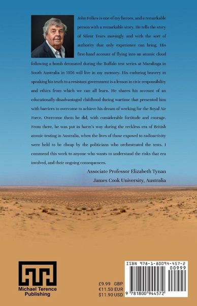 John Folkes is one of my heroes, and a remarkable person with a remarkable story. He tells the story of Silent Tears movingly and with the sort of authority that only experience can bring. His first-hand account of flying into an atomic cloud following a bomb detonated during the Buffalo test series at Maralinga in South Australia in 1956 will live in my memory. His enduring bravery in speaking his truth to a resistant government is a lesson in civic responsibility and ethics from which we can all learn. He shares his account of an educationally-disadvantaged childhood during wartime that presented him with barriers to overcome to achieve his dream of working for the Royal Air Force. Overcome them he did, with considerable fortitude and courage. From there, he was put in harm's way during the reckless era of British atomic testing in Australia, when the lives of those exposed to radioactivity were held to be cheap by the politicians who orchestrated the tests. I commend this work to anyone who wants to understand the risks that era involved, and their ongoing consequences. - Associate Professor Elizabeth Tynan James Cook University, Australia