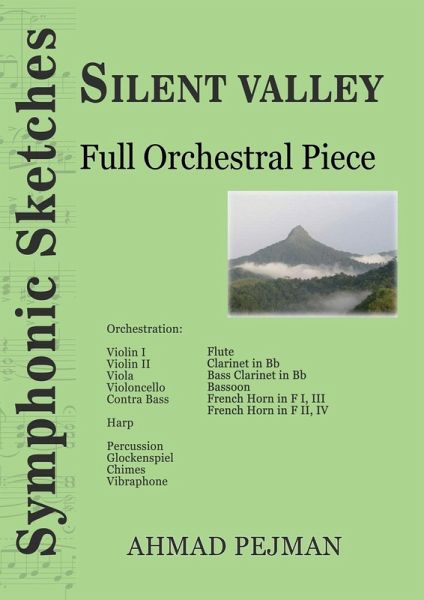 Ahmad Pejman's Symphonic Sketches: Silent Valley is an epic Full orchestral printed music. Ideal for Music schools and orchestras. Orchestration: Violin I Violin II Viola Violoncello Contra Bass Flute Clarinet in Bb Bass Clarinet in Bb Bassoon French Horn in F I, III French Horn in F II, IV Harp Percussion Glockenspiel, Chimes Vibraphone