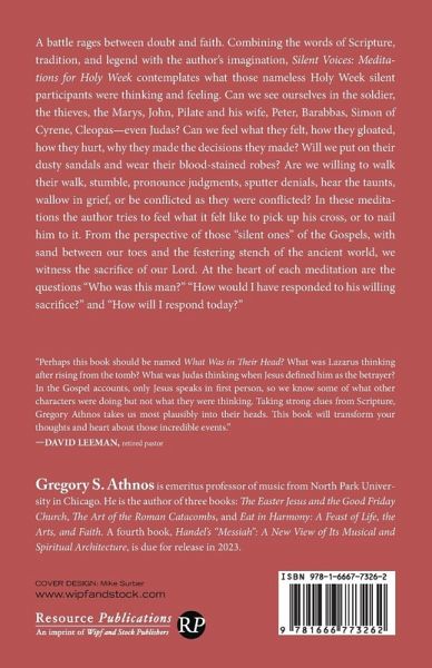 A battle rages between doubt and faith. Combining the words of Scripture, tradition, and legend with the author's imagination, Silent Voices: Meditations for Holy Week contemplates what those nameless Holy Week silent participants were thinking and feeling. Can we see ourselves in the soldier, the thieves, the Marys, John, Pilate and his wife, Peter, Barabbas, Simon of Cyrene, Cleopas--even Judas? Can we feel what they felt, how they gloated, how they hurt, why they made the decisions they made? Will we put on their dusty sandals and wear their blood-stained robes? Are we willing to walk their walk, stumble, pronounce judgments, sputter denials, hear the taunts, wallow in grief, or be conflicted as they were conflicted? In these meditations the author tries to feel what it felt like to pick up his cross, or to nail him to it. From the perspective of those ""silent ones"" of the Gospels, with sand between our toes and the festering stench of the ancient world, we witness the sacrifice of our Lord. At the heart of each meditation are the questions ""Who was this man?"" ""How would I have responded to his willing sacrifice?"" and ""How will I respond today?""