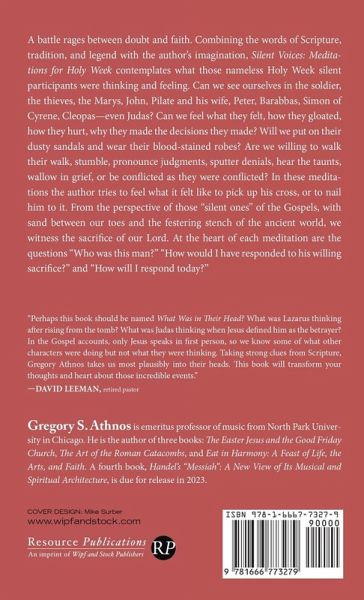 A battle rages between doubt and faith. Combining the words of Scripture, tradition, and legend with the author's imagination, Silent Voices: Meditations for Holy Week contemplates what those nameless Holy Week silent participants were thinking and feeling. Can we see ourselves in the soldier, the thieves, the Marys, John, Pilate and his wife, Peter, Barabbas, Simon of Cyrene, Cleopas--even Judas? Can we feel what they felt, how they gloated, how they hurt, why they made the decisions they made? Will we put on their dusty sandals and wear their blood-stained robes? Are we willing to walk their walk, stumble, pronounce judgments, sputter denials, hear the taunts, wallow in grief, or be conflicted as they were conflicted? In these meditations the author tries to feel what it felt like to pick up his cross, or to nail him to it. From the perspective of those ""silent ones"" of the Gospels, with sand between our toes and the festering stench of the ancient world, we witness the sacrifice of our Lord. At the heart of each meditation are the questions ""Who was this man?"" ""How would I have responded to his willing sacrifice?"" and ""How will I respond today?""