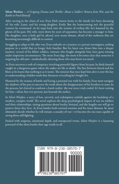 Silent Warfare - A Gripping Drama and Thriller About a Soldier's Return from War and the Battle to Find Himself After serving in the chaos of war, Evan Holt returns home to the family he's been dreaming of: his wife, Laura, and his young daughter, Emily. But the homecoming isn't the peaceful reunion he envisioned. As he steps back into the routine of civilian life, he's haunted by the ghosts of his past. His wife, worn down by years of separation, has become a stranger to him. His daughter, once a little girl he adored, now seems distant, afraid of the outbursts that are becoming increasingly difficult to control. Struggling to adapt to life after war, Evan embarks on a journey as a private investigator, seeking purpose in a world that no longer feels familiar. But his latest case draws him into a deeper mystery: several of his fellow soldiers, veterans who fought alongside him, have gone missing under suspicious circumstances. The more Evan digs, the more it becomes clear that someone is targeting his old unit-methodically silencing those who may know too much. As Evan uncovers a web of conspiracy involving powerful figures from his past, he finds himself caught in a dangerous game where the stakes are life or death. The line between friend and foe blurs as he learns that nothing is as it seems. The mission that once kept him alive is now the key to understanding a hidden truth that threatens everything he's fought for. Haunted by the trauma of battle and facing a personal war with his family, Evan must navigate the shadows of his past to uncover the truth about the disappearance of his brothers in arms. In the process, he's forced to confront a harsh reality: the war never truly ended. It's been waiting for him-silent, but ever-present, just beneath the surface. In Silent Warfare, a story of loss, survival, and redemption unfolds against the backdrop of a modern, complex world. The novel explores the deep psychological impact of war on soldiers and their relationships, raising questions about loyalty, betrayal, and the lengths one will go to protect those they love. As Evan battles both external enemies and his inner demons, he must ultimately decide whether he will remain a casualty of war-or become the one man capable of saving those still fighting. Packed with suspense, emotional depth, and unexpected twists, Silent Warfare is a haunting portrayal of the silent battles that rage inside us all.