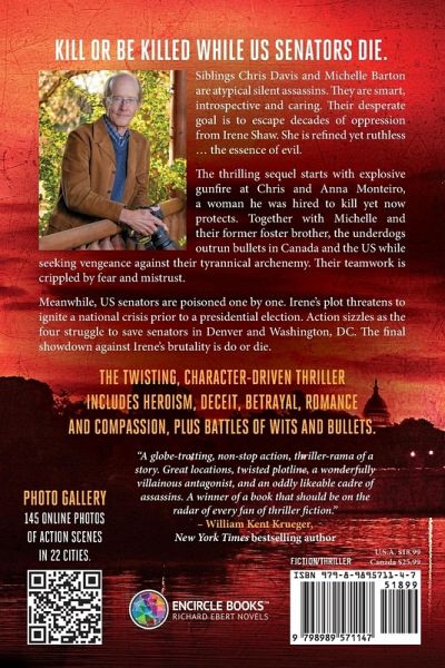 Kill or be killed while US senators die. Siblings Chris Davis and Michelle Barton are atypical silent assassins. They are smart, introspective and caring. Their desperate goal is to escape decades of oppression from Irene Shaw. She is refined yet ruthless ... the essence of evil. The thrilling sequel starts with explosive gunfire at Chris and Anna Monteiro, a woman he was hired to kill yet now protects. Together with Michelle and their former foster brother, the underdogs outrun bullets in Canada and the US while seeking vengeance against their tyrannical archenemy. Their teamwork is crippled by fear and mistrust. Meanwhile, US senators are poisoned one by one. Irene's plot threatens to ignite a national crisis prior to a presidential election. Action sizzles as the four struggle to save senators in Denver and Washington, DC. The final showdown against Irene's brutality is do or die. The twisting, character-driven thriller includes heroism, deceit, betrayal, romance and compassion, plus battles of wits and bullets. QR codes link to 145 online photos of action scenes in 22 cities and 4 countries.