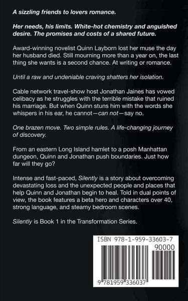 Her needs, his limits. White-hot chemistry and anguished desire. The promises and costs of a shared future: A slow-burn, friends to lovers romance. Award-winning novelist Quinn Layborn lost her muse the day her husband died. Still mourning more than a year on, the last thing she wants is a second chance. At writing or romance. Tonight, as dinner guests gossip in her breezy beach house-her agent's well-meaning intervention-she arms herself with a full glass of red wine: Don't come close. Until a raw and undeniable craving shatters her isolation. Cable network travel-show host Jonathan Jaines still struggles with the terrible mistake that ruined his marriage. Tonight, he watches Quinn move among the guests like a ghost. His heart aches for her. The vivacious woman he knew from the movie set a few years ago? Gone, replaced with a grieving widow. When she stuns him with the words she whispers in his ear, he cannot-can not-say no. One brazen move. Two simple rules. A journey of sensual discovery that will transform both their lives. From an eastern Long Island hamlet to a posh Manhattan dungeon, Quinn and Jonathan push the boundaries. Between pleasure and pain, control and surrender, trust and forgiveness. But as feelings and the risk of heartbreak grow, as their pasts and potential future collide, just how far is too far? Briskly paced and intense, Silently is a story about overcoming devastating loss and the unexpected people and places that help us begin to heal. Told in dual points of view, the book features a beta hero and characters over 40, strong language, and super-steamy bedroom scenes. (Length: approximately 43,000 words.) Silently is Book 1 in the Transformation Series. The books should be read in order.