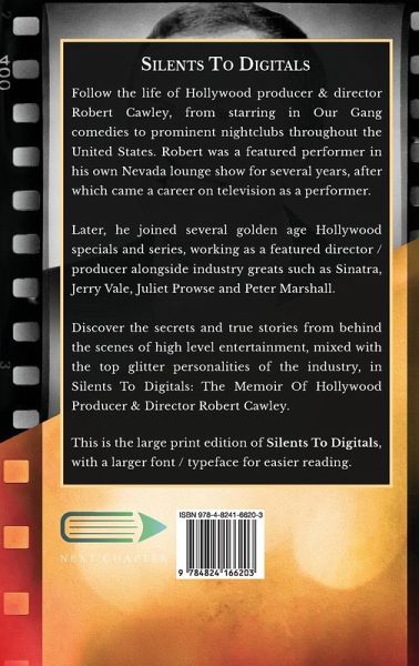 Follow the life of Hollywood producer & director Robert Cawley, from starring in Our Gang comedies to prominent nightclubs throughout the United States. Robert was a featured performer in his own Nevada lounge show for several years, after which came a career on television as a performer. Later, he joined several golden age Hollywood specials and series, working as a featured director / producer alongside industry greats such as Sinatra, Jerry Vale, Juliet Prowse and Peter Marshall. Discover the secrets and true stories from behind the scenes of high level entertainment, mixed with the top glitter personalities of the industry, in Silents To Digitals: The Memoir Of Hollywood Producer & Director Robert Cawley. This is the large print edition of Silents To Digitals, with a larger font / typeface for easier reading.