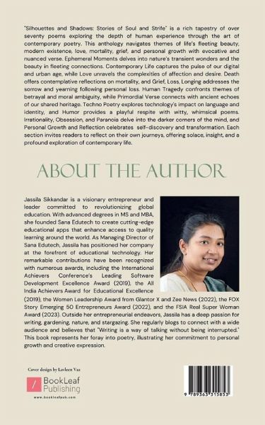 Jassila Sikkandar is a visionary entrepreneur and leader committed to revolutionizing global education. With advanced degrees in MS and MBA, she founded Sana Edutech to create cutting-edge educational apps that enhance access to quality learning around the world. As Managing Director of Sana Edutech, Jassila has positioned her company at the forefront of educational technology. Her remarkable contributions have been recognized with numerous awards, including the International Achievers Conference's Leading Software Development Excellence Award (2019), the All India Achievers Award for Educational Excellence (2019), the Women Leadership Award from Glantor X and Zee News (2022), the FOX Story Emerging 50 Entrepreneurs Award (2022), and the FSIA Real Super Woman Award (2023). Outside her entrepreneurial endeavors, Jassila has a deep passion for writing, gardening, nature, and stargazing. She regularly blogs to connect with a wide audience and believes that ""Writing is a way of talking without being interrupted."" This book represents her foray into poetry, illustrating her commitment to personal growth and creative expression.