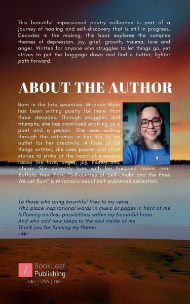 Born in the late seventies, Miranda Mohr has been writing poetry for more than three decades. Through struggles and triumphs, she has continued evolving as a poet and a person. She uses writing through the extremes in her life as an outlet for her creativity. A lover of all things written, she uses poems and short stories to strike at the heart of everyday issues like love, anger, joy, money, and abuse. She currently lives with her husband James near Buffalo, New York. "Silhouettes of Self-Doubt and the Fires we let Burn" is Miranda's debut self-published collection.