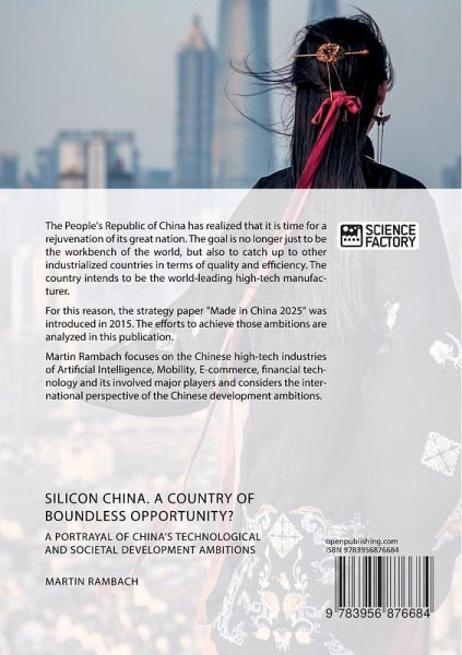 The People's Republic of China has realized that it is time for a rejuvenation of its great nation. The goal is no longer just to be the workbench of the world, but also to catch up to other industrialized countries in terms of quality and efficiency. The country intends to be the world-leading high-tech manufacturer. For this reason, the strategy paper "Made in China 2025" was introduced in 2015. The efforts to achieve those ambitions are analyzed in this publication. Martin Rambach focuses on the Chinese high-tech industries of Artificial Intelligence, Mobility, E-commerce, financial technology and its involved major players and considers the international perspective of the Chinese development ambitions. Keywords: - China; - Artificial Intelligence; - High Technology; - Made in China 2025; - E-Commerce