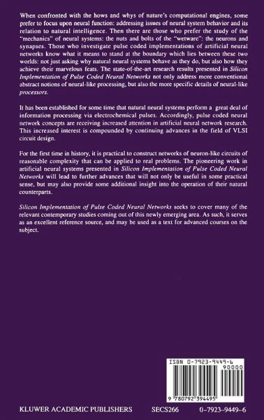 When confronted with the hows and whys of nature's computational engines, some prefer to focus upon neural function: addressing issues of neural system behavior and its relation to natural intelligence. Then there are those who prefer the study of the "mechanics" of neural systems: the nuts and bolts of the "wetware": the neurons and synapses. Those who investigate pulse coded implementations ofartificial neural networks know what it means to stand at the boundary which lies between these two worlds: not just asking why natural neural systems behave as they do, but also how they achieve their marvelous feats. The research results presented in this book not only address more conventional abstract notions of neural-like processing, but also the more specific details ofneural-like processors. It has been established for some time that natural neural systems perform a great deal of information processing via electrochemical pulses. Accordingly, pulse coded neural network concepts arereceiving increased attention in artificial neural network research. This increased interest is compounded by continuing advances in the field of VLSI circuit design. This is the first time in history in which it is practical to construct networks of neuron-like circuits of reasonable complexity that can be applied to real problems. We believe that the pioneering work in artificial neural systems presented in this book will lead to further advances that will not only be useful in some practical sense, but may also provide some additional insight into the operation of their natural counterparts.