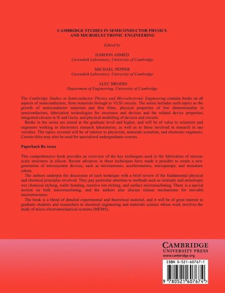 This comprehensive book provides an overview of the key techniques used in the fabrication of micron-scale structures in silicon. Recent advances in these techniques have made it possible to create a new generation of microsystem devices, such as microsensors, accelerometers, micropumps, and miniature robots. The authors underpin the discussion of each technique with a brief review of the fundamental physical and chemical principles involved. They pay particular attention to methods such as isotropic and anisotropic wet chemical etching, wafer bonding, reactive ion etching, and surface micromachining. There is a special section on bulk micromachining, and the authors also discuss release mechanisms for movable microstructures. The book is a blend of detailed experimental and theoretical material, and will be of great interest to graduate students and researchers in electrical engineering and materials science whose work involves the study of micro-electromechanical systems (MEMS).