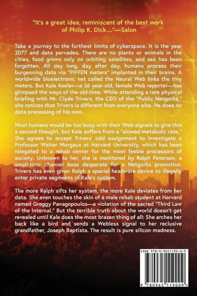"It's a great idea, reminiscent of the best work of Philip K. Dick…" -Salon Take a journey to the furthest limits of cyberspace. It is the year 2077 and data pervades. There are no plants or animals in the cities, food grows only on orbiting satellites, and sex has been forgotten. All day long, day after day, humans process their burgeoning data via "PIFFEN meters" implanted in their brains. A worldwide bioelectronic net called the Neural Web links the tiny meters. But Kale Keeler-a 26 year-old, female Web reporter-has glimpsed the ways of the old-time. While attending a rare physical briefing with Mr. Clyde Trivers, the CEO of the "Public Netgorks," she notices that Trivers is different from everyone else. He does no data processing of his own. Most humans would be too busy with their Web-signals to give this a second thought, but Kale suffers from a "slowed metabolic rate." She agrees to accept Trivers' odd assignment to investigate a Professor Walter Morgaux at Harvard University, which has been relegated to a rehab center for the most feeble processors of society. Unknown to her, she is monitored by Ralph Peterson, a small-time channel boss desperate for a Netgorks promotion. Trivers has even given Ralph a special headware device to illegally enter private segments of Kale's system. The more Ralph sifts her system, the more Kale deviates from her data. She even touches the skin of a male rehab student at Harvard named Greggy Panagopoulos-a violation of the sacred "Third Law of the Internal." But the terrible truth about the world doesn't get revealed until Kale does the most brazen thing of all: She arches her back like a bird and sends a Webless signal to her reclusive grandfather, Joseph Baptista. The result is pure silicon madness. If you're worried about where the Internet is leading, you may want to read this book. If you aren't worried, you BETTER read this book!