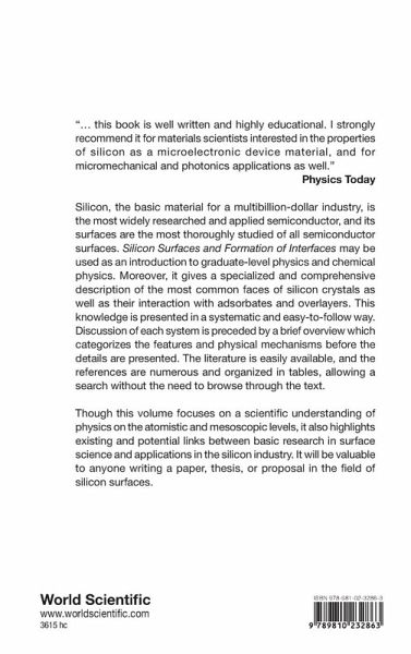 Silicon, the basic material for a multibillion-dollar industry, is the most widely researched and applied semiconductor, and its surfaces are the most thoroughly studied of all semiconductor surfaces. Silicon Surfaces and Formation of Interfaces may be used as an introduction to graduate-level physics and chemical physics. Moreover, it gives a specialized and comprehensive description of the most common faces of silicon crystals as well as their interaction with adsorbates and overlayers. This knowledge is presented in a systematic and easy-to-follow way. Discussion of each system is preceded by a brief overview which categorizes the features and physical mechanisms before the details are presented. The literature is easily available, and the references are numerous and organized in tables, allowing a search without the need to browse through the text. Though this volume focuses on a scientific understanding of physics on the atomistic and mesoscopic levels, it also highlights existing and potential links between basic research in surface science and applications in the silicon industry. It will be valuable to anyone writing a paper, thesis, or proposal in the field of silicon surfaces.