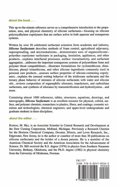 "Serves as a comprehensive introduction to the preparation, uses, and physical chemistry of silicone surfactants--focusing on silicone polyoxyalkylene copolymers that are surface active in both aqueous and nonaqueous systems. Covers applications in the manufacture of polyurethane foam, coatings, wetting agents, fabric finishes, and polymer surface modifiers."