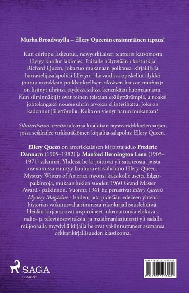 Murha Broadwaylla ¿ Ellery Queenin ensimmäinen tapaus! Kun esirippu laskeutuu, newyorkilaisen teatterin katsomosta löytyy kuollut lakimies. Paikalle hälytetään rikostutkija Richard Queen, joka tuo mukanaan poikansa, kirjailija ja harrastelijasalapoliisi Elleryn. Harvardissa opiskellut älykkö joutuu vastakkain poikkeuksellisen rikoksen kanssa: murhaaja on listinyt uhrinsa täydessä salissa kenenkään huomaamatta. Kun silminnäkijät ovat toinen toistaan epäilyttävämpiä, ainoaksi johtolangaksi nousee uhrin arvokas silinterihattu, joka on kadonnut jäljettömiin. Kuka on vienyt hatun mukanaan? Silinterihatun arvoitus aloittaa kuuluisan mysteeridekkarien sarjan, jossa seikkailee tarkkanäköinen kirjailija-salapoliisi Ellery Queen.