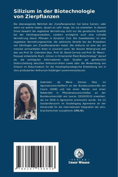 Die überwiegende Mehrheit der Zierpflanzenarten hat keine Samen, oder wenn sie welche haben, dauert es sehr lange, bis sie entstehen. In diesem Sinne bewahrt die vegetative Vermehrung nicht nur die genetische Qualität bei der Sämlingsproduktion, sondern ermöglicht auch eine schnelle Vermehrung dieser Pflanzen in kürzester Zeit. Die Gewebekultur ist eine vegetative Vermehrungstechnik, die zahlreiche Vorteile bei der Produktion von Sämlingen von Zierpflanzenarten bietet. Die Anthurie ist eine der am meisten vermarkteten Arten in unserem Land. Vor diesem Hintergrund zielt das von Prof. Dr. Gabrielen Dias, Prof. Dr. David Correia und Prof. Dr. Moacir Pasqual entwickelte Buch "Silicon in Ornamental Plant Biotechnology" darauf ab, die wichtigsten Informationen über Studien zur genetischen Unterscheidung zwischen Anthurium-Arten sowie über die Verwendung von Silizium im Kulturmedium für die morphophysiologische Entwicklung von in vitro produzierten Anthurium-Setzlingen zusammenzufassen.