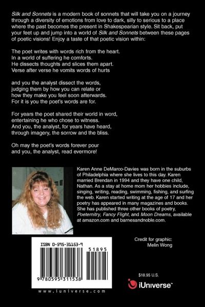 Silk and Sonnets is a modern book of sonnets that will take you on a journey through a diversity of emotions from love to dark, silly to serious to a place where the past becomes the present in Shakespearian style. Sit back, put your feet up and jump into a world of Silk and Sonnets between these pages of poetic visions! Enjoy a taste of that poetic vision within: The poet writes with words rich from the heart. In a world of suffering he comforts. He dissects thoughts and slices them apart. Verse after verse he vomits words of hurts and you the analyst dissect the words, judging them by how you can relate or how they make you feel soon afterwards. For it is you the poet's words are for. For years the poet shared their world in word, entertaining he who chose to witness. And you, the analyst, for years have heard, through imagery, the sorrow and the bliss. Oh may the poet's words forever pour and you, the analyst, read evermore!