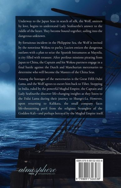 Underway to the Japan Seas in search of silk, the Wolf, smitten by love, begins to understand Lady Seafourthe's answer to the riddle of the heart. They become bound together, sailing into the dangerous unknown. By fortuitous incident in the Philippine Sea, the Wolf is invited by the notorious Wokou to parley. Lucien entices the dangerous outlaws with a plan to seize the Spanish Intramuros at Maynila, a city filled with treasure. After perilous missions pirating from Japan to China, the Captain and his Wokou partners engage in a final battle against the Dutch and Manchurian mercenaries to determine who will become the Masters of the China Seas. Among the hostages of the mercenaries is the Great Fifth Dalai Lama, and the Wolf agrees to escort him back to Tibet. Stopping in India, ruled by the powerful Mughal Empire, the Captain and Lady Seafourthe discover life-changing insights as they listen to the Dalai Lama during their journey to Shangri-La. However, upon returning to Kalikata, the small company faces life-threatening peril from the religious Stranglers of the Goddess Kali-and perhaps betrayal by the Mughal Empire itself.