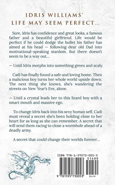 Idris Williams’ life may seem perfect… Sure, Idris has confidence and great looks, a famous father and a beautiful girlfriend. Life would be perfect if he could dodge the bullet his father has aimed at his head — following dear old Dad into motivational-speaking stardom. But there doesn’t seem to be a way out… — Until Idris morphs into something green and scaly. Cadi has finally found a safe and loving home. Then a malicious boy turns her whole world upside down. The next thing she knows, she’s wandering the streets on New Year’s Eve, alone. — Until a crystal leads her to this lizard boy with a smart mouth and massive ego. To change Idris back into his sexy human self, Cadi must reveal a secret she’s been holding close to her heart for as long as she can remember. A secret that will send them racing to close a wormhole ahead of a deadly army. A secret that could change their worlds forever…