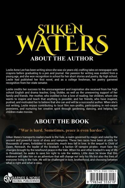 "War is hard. Sometimes, peace is even harder." Silken Waters transports readers back to the Vale, a realm governed by magic and ruled by the ancient and powerful races of elves and vampires. These two races have been at odds for thousands of years, forbidden to associate, much less fall in love. In the sequel to Child of Dawn, Rennault, the leader of the bradach a faction Of vampire pirates- must face the changes brought by the newfound peace in the Vale. When his and other bradach's way of life is threatened, he seeks to save his right to rule the waters, Little does he know that this endeavor will take him on an adventure that will change not only his life but also the lives of everyone living in the Vale. He will be challenged in love, brotherhood, and choosing between what is right and what is easy.