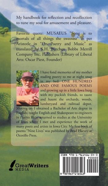 My handbook for reflection and recollection to tune my soul for amusement and pleasure. Favorite quote: MUSAEUS "Song is to mortals of all things the sweetest" as per Aristotle in "On Poetry and Music" as translated by S.H. Butcher: Bobbs Merrill Company Inc. Publishers (Library of Liberal Arts: Oscar Piest, Founder)