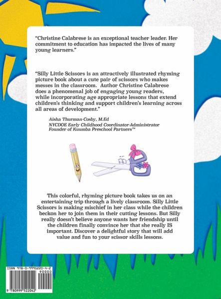 This colorful, rhyming picture book takes us on an entertaining trip through a lively classroom. Silly Little Scissors is making mischief in her class while the children beckon her to join them in their cutting lessons. But Silly really doesn't believe anyone wants her friendship until the children finally convince her that she really IS important. Discover a delightful story that will add value and fun to your scissors skills lessons.