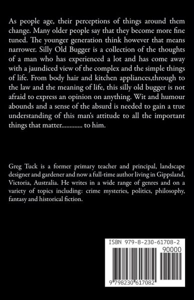 As people age, their perceptions of things around them change. Many older people say that they become more fine tuned. The younger generation think however that means narrower. Silly Old Bugger is a collection of the thoughts of a man who has experienced a lot and has come away with a jaundiced view of the complex and the simple things of life. From body hair and kitchen appliances,through to the law and the meaning of life, this silly old bugger is not afraid to express an opinion on anything. Wit and humour abounds and a sense of the absurd is needed to gain a true understanding of this man's attitude to all the important things that matter............. to him.