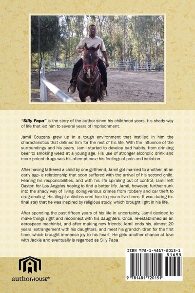 "Silly Papa" is the story of the author since his childhood years, his shady way of life that led him to several years of imprisonment. Jamil Couzens grew up in a tough environment that instilled in him the characteristics that defined him for the rest of his life. With the influence of the surroundings and his peers, Jamil started to develop bad habits, from drinking beer to smoking weed at a young age. His use of stronger alcoholic drink and more potent drugs was his attempt ease his feelings of pain and isolation. After having fathered a child by one girlfriend, Jamil got married to another, at an early age- a relationship that soon suffered with the arrival of his second child. Fearing his responsibilities, and with his life spiraling out of control, Jamil left Dayton for Los Angeles hoping to find a better life. Jamil, however, further sunk into the shady way of living, doing various crimes from robbery and car theft to drug dealing. His illegal activities sent him to prison five times. It was during his final stay that he was inspired by religious study, which brought light in his life. After spending the past fifteen years of his life in uncertainty, Jamil decided to make things right and reconnect with his daughters. Once re-established as a aerospace machinist and after making new friends. Jamil ends his, almkost 20 years, estrangement with his daughters, and meets his grandchildren for the first time, which brought immense joy to his heart. He gets another chance at love with Jackie and eventually is regarded as Silly Papa.
