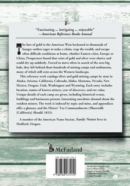 The lure of gold in the American West beckoned to thousands of hungry settlers eager to stake a claim, reap the wealth, and escape often difficult conditions at home, whether Eastern cities, Europe or China. Prospectors found that veins of gold and silver were elusive and could dry up suddenly. Forced to move often in search of the next big lode, they left behind them hundreds of mining camps and settlements, many of which still exist across the Western landscape. This reference work catalogs silver and gold mining camps by state in Alaska, Arizona, California, Colorado, Idaho, Montana, Nevada, New Mexico, Oregon, Utah, Washington and Wyoming. Each entry includes location, names of known miners, year of discovery, and ore value. Unique details of each camp are given, including historical events, buildings and businesses present. Interesting anecdotes abound about the resident miners. The work is indexed by topic and mine, and appendices offer a glossary and the Miners' Ten Commandments (Placerville [California] Herald, 1853).