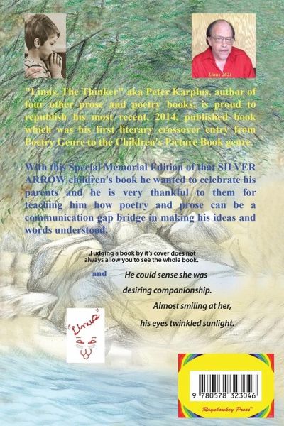 "Linus, The Thinker" aka Peter Karplus, author of four other prose and poetry books, is proud to republish his most recent, 2014, published book which was his first literary crossover entry from Poetry Genre to the Children's Picture Book genre. With his Special Memorial Edition of the SILVER ARROW children's book he wanted to celebrate his parents and he is very thankful to them for teaching him how poetry and prose can be a communication gap bridge in making his ideas and words understood. Judging a book by it's cover does not always allow you to see the whole book. He could sense she was desiring companionship. Almost smiling at her, his eyes twinkled sunlight.