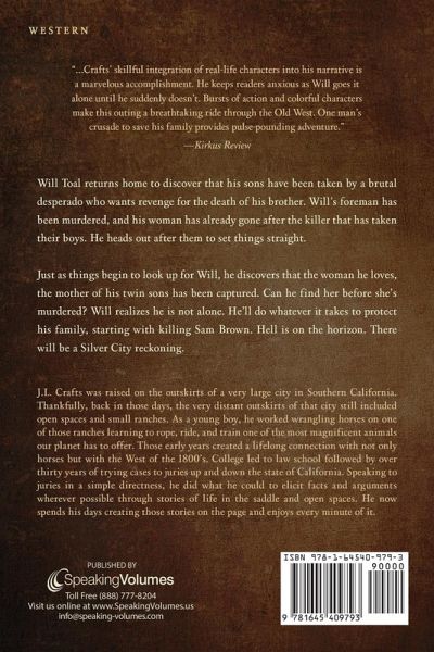 Will Toal returns home to discover that his sons have been taken by a brutal desperado who wants revenge for the death of his brother. Will's foreman has been murdered, and his woman has already gone after the killer that has taken their boys. He heads out after them to set things straight. Just as things begin to look up for Will, he discovers that the woman he loves, the mother of his twin sons has been captured. Can he find her before she's murdered? Will realizes he is not alone. He'll do whatever it takes to protect his family, starting with killing Sam Brown. Hell is on the horizon. There will be a SILVER CITY RECKONING "...Crafts' skillful integration of real-life characters into his narrative is a marvelous accomplishment. He keeps readers anxious as Will goes it alone until he suddenly doesn't. Bursts of action and colorful characters make this outing a breathtaking ride through the Old West. One man's crusade to save his family provides pulse-pounding adventure." -Kirkus Review