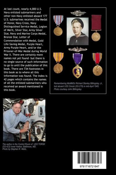 At last count, nearly 4,000 U.S. Navy enlisted submariners aboard 177 U.S. submarines received the Medal of Honor, Navy Cross, Navy Distinguished Service Medal, Legion of Merit, Silver Star, Army Silver Star, Navy and Marine Corps Medal, Bronze Star, Letter of Commendation with Medal, Gold Life-Saving Medal, Purple Heart, Army Purple Heart, and/or the Prisoner-of-War Medal during World War II. There are 734 footnotes and a 42-page Index