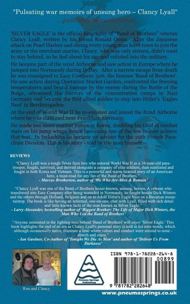 'SILVER EAGLE', the official biography of "Band of Brothers" veteran Clancy Lyall, written by his friend Ronald Ooms. After the Japanese attack on Pearl Harbor and seeing every young man leave town to join the army or the merchant marine, Clancy, who was only sixteen, didn't want to stay behind. He lied about his age and enlisted into the military. He became part of the 101st Airborne and saw action in Europe where he jumped into Normandy during D-Day. After a narrow escape from death he was reassigned to Easy Company 506, the famous 'Band of Brothers'. He saw action during Operation Market Garden, confronted the freezing temperatures and brutal barrage by the enemy during the Battle of the Bulge, witnessed the horrors of the concentration camps in Nazi Germany and became the first allied soldier to step into Hitler's 'Eagles Nest' in Berchtesgaden. At the end of World War II he re-enlisted and joined the 82nd Airborne where he was stationed near Frankfurt, Germany. He made two more combat jumps in Korea, doubling his total of combat stars on his jump wings. And with that becoming one of the few to ever achieve that feat. In Indochina he became an adviser for the 29th French Parachute Division. This is his story told by the man himself.