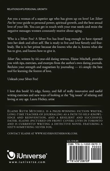Are you a woman over 50 who has given up on love? Let Silver Fox be your guide to personal power, spiritual growth, and the best sexual love of your life. The dating world can be tough. Yet, thanks to this ingenious dating journal, many older women are attracting lovely men as they unleash their Silver Fox selves. Silver Fox, written by a 66-year-old dating veteran, provides you with tips, exercises, and the author's journal excerpts. Reclaim your strength and magnetism by journaling-it's simply the best tool for learning the foxtrot of love. "I love this book! It's edgy, funny, and full of really innovative and useful writing exercises and new ways of looking at the "big issues" of relating and loving at any age." -Laura Hickey, artist "Elaine is a remarkable teacher and an incredible role model. She is the perfect guide and coach for later-life dating and personal growth through journaling." - Arei Bierstock, M.S.W. "As one of the women lucky enough to be in Elaine's writing class for the last twenty years, I have come to see life after fifty as a great adventure. Silver Fox is so much fun that it makes me wish I were single again!" -Lola Rasminsky, President, Beyond the Box¿ "I am fortunate to belong to a group of women over 50 whom Elaine has inspired to explore the bright possibilities in the third trimester of life." -Bonnie MacLachlan, Classics Professor, University of Western Ontario