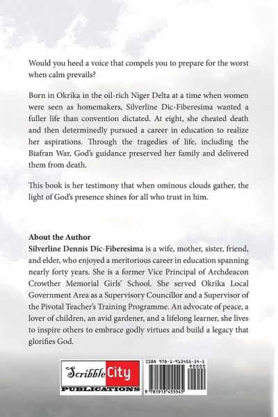Would you heed a voice that compels you to prepare for the worst when calm prevails? Born in Okrika in the oil-rich Niger Delta at a time when women were seen as homemakers, Silverline Dic-Fiberesima wanted a fuller life than convention dictated. At eight, she cheated death and then determinedly pursued a career in education to realize her aspirations. Through the tragedies of life, including the Biafran War, God's guidance preserved her family and delivered them from death. This book is her testimony that when ominous clouds gather, the light of God's presence shines for all who trust in him.