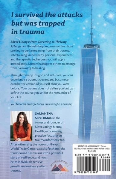 I survived the attacks but was trapped in trauma. Silver Linings: From Surviving to Thriving After 9/11 is the self-help and memoir for those seeking to derive meaning from their trauma. Intertwining vulnerability, personal experiences and therapeutic techniques you will apply immediately, Samantha inspires others to emerge from harrowing to healing. Through therapy, insight, and self-care, you can experience a traumatic event and become an even better version of yourself than you were before. Your trauma does not define you but can define the course you set for the remainder of your life. You too can emerge from Surviving to Thriving.